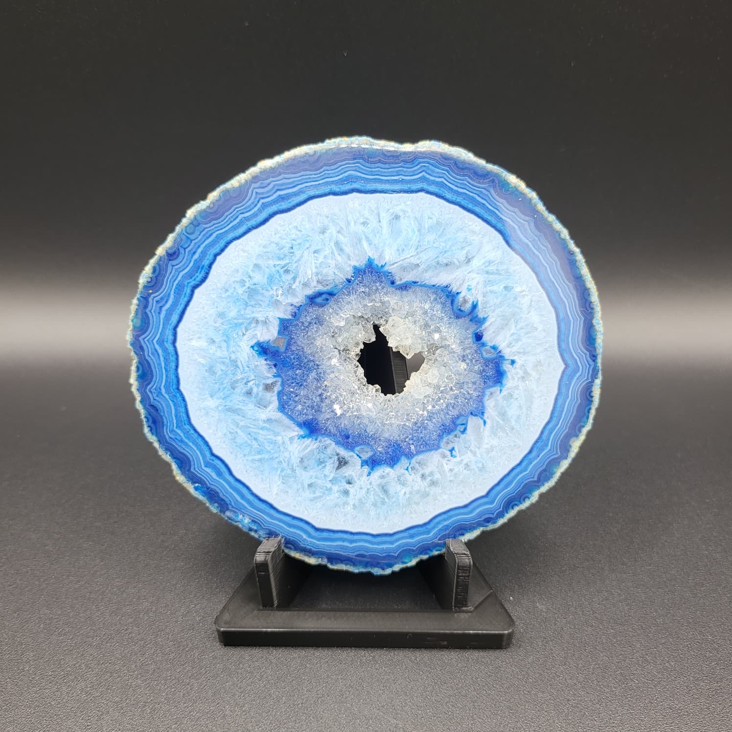 Diese beeindruckende blaue Achat Geoden-Scheibe auf Standfuß fasziniert mit ihrem konzentrischen Farbspiel aus sanften Hellblautönen, kräftigem Königsblau und einer funkelnden Kristall-Druse im Zentrum. Die natürlich gewachsenen Bänderungen des Achats umrahmen die offene Kristallstruktur und verleihen diesem Edelstein eine außergewöhnliche Tiefe und Ausdruckskraft.